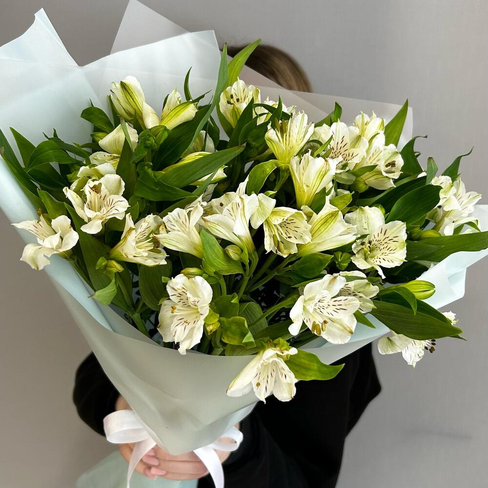 Альстромерия – 9 шт.Упаковка дизайнерская – 2 шт.Лента атласная – 1 шт.Зелень – 2 шт.
