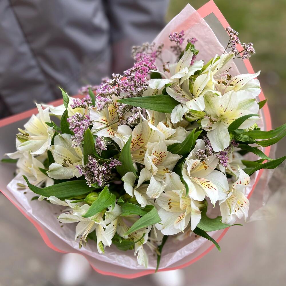 Альстромерия – 5 шт. Лимониум – 2 шт. Упаковка дизайнерская – 1 шт.