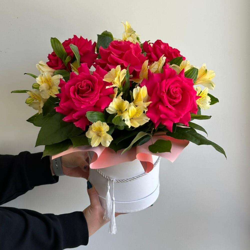 Яркая коробка из роз и альстельмерии порадует Вас и ваших близких