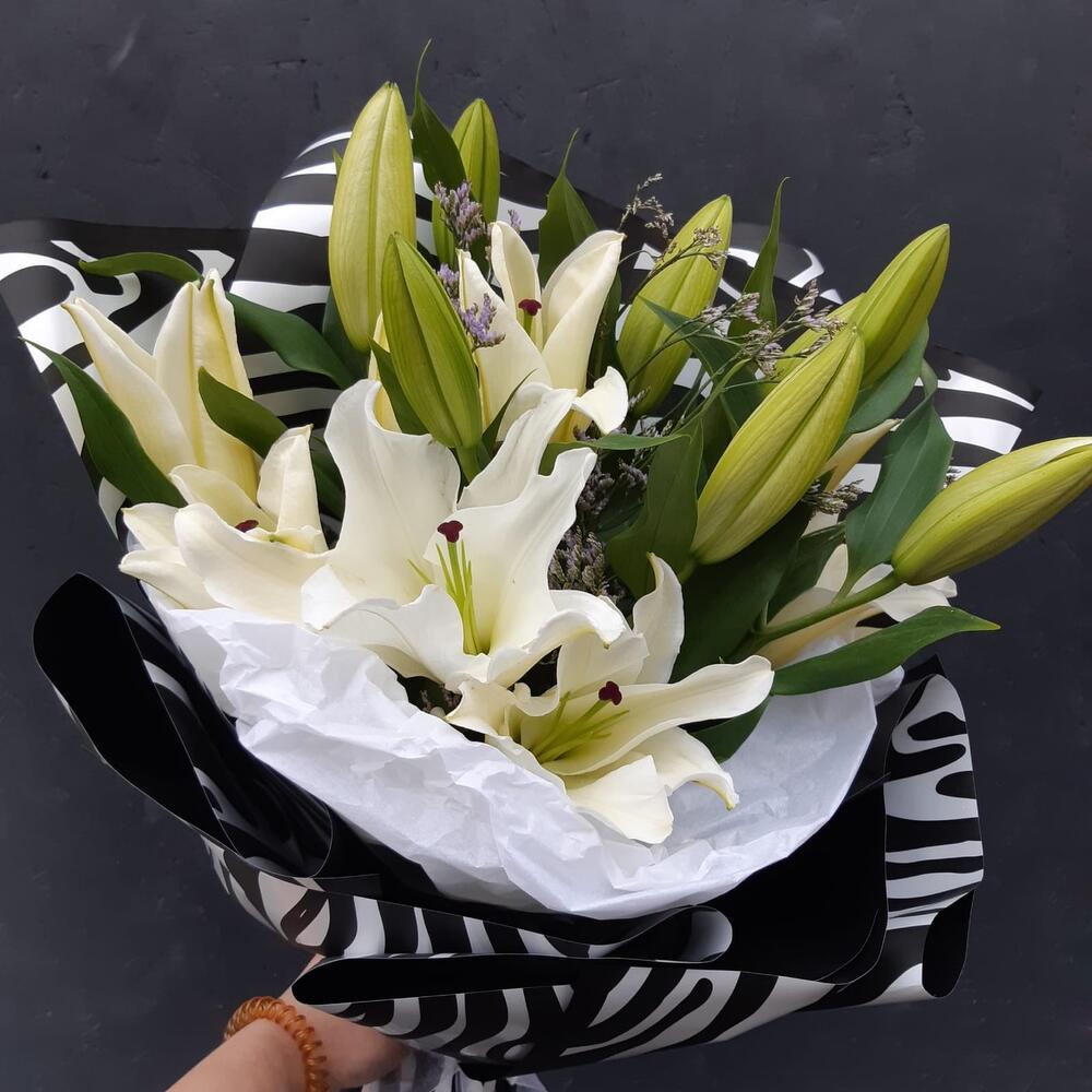 Лилия белая – 5 шт.лимониум или гипсофила или статица – 2 шт.Упаковка дизайнерская – 2 шт.Лента атласная – 1 шт.