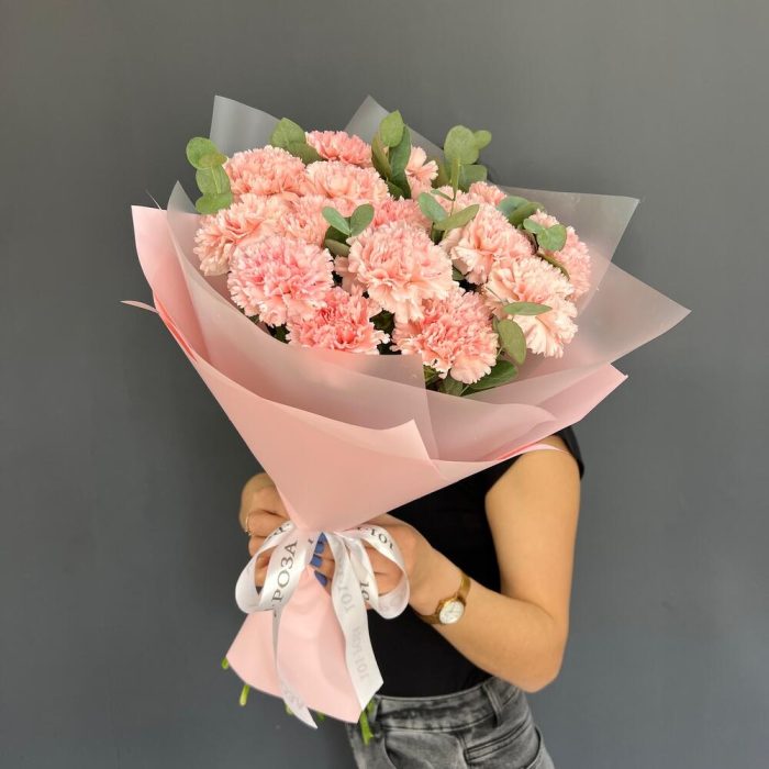 17 нежно-розовых диантусов с эвкалиптом