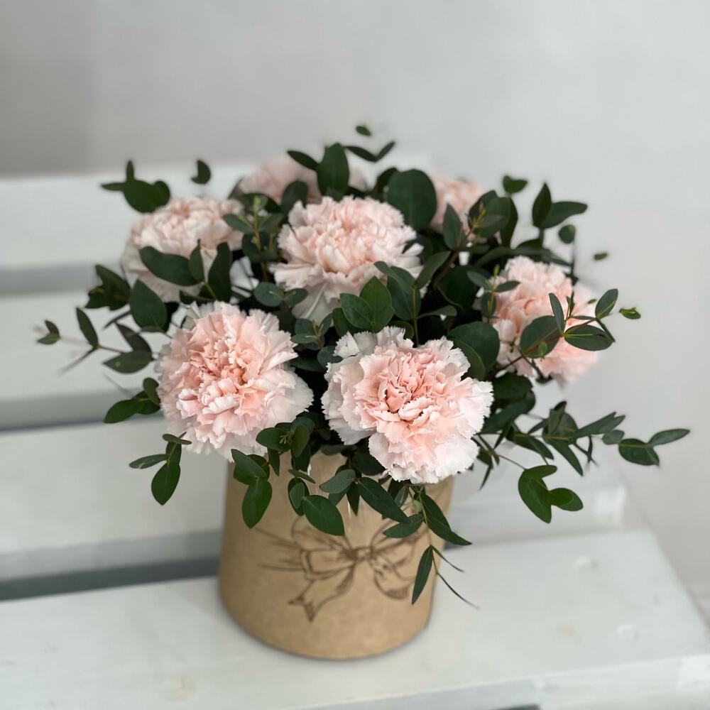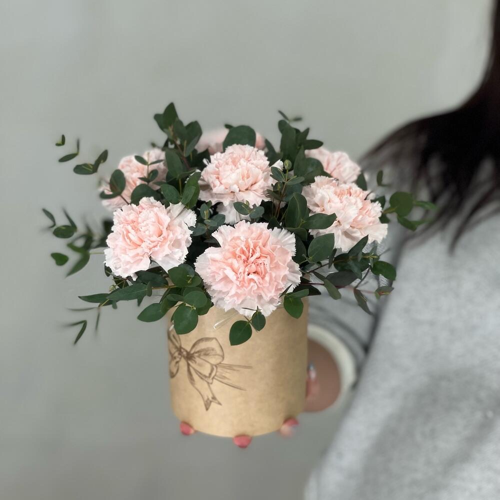 Эвкалипт – 2 шт.коробочка с оазисом – 1 шт.гвоздика кремовая диантус – 7 шт.