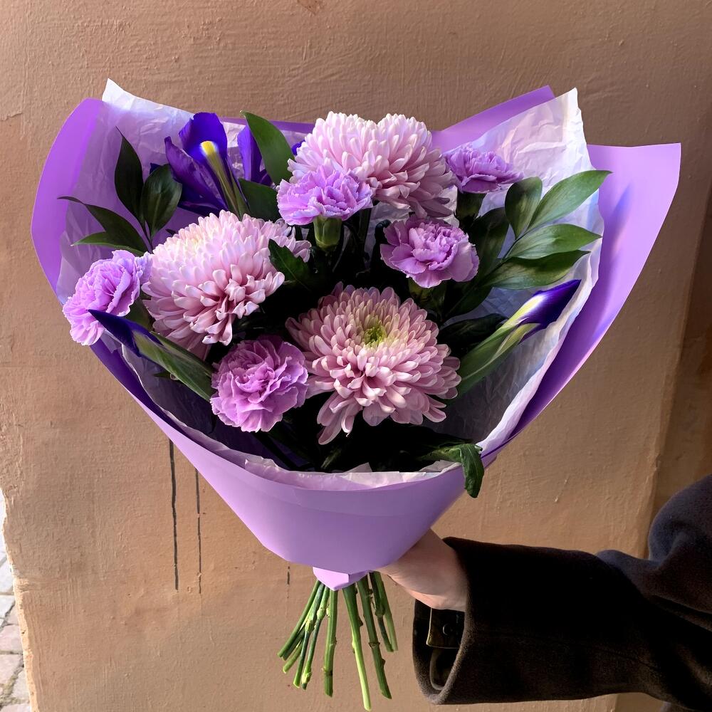 Гвоздика лунная – 5 шт.Ирис синий – 3 шт.Рускус сочи – 5 шт.Авторская упаковка – 1 шт.хризантема сиреневая одноголовая – 3 шт.