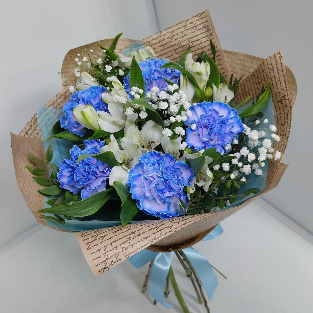 Букет из 5 Диантусов голубых, Альстромерии и Гипсофилы