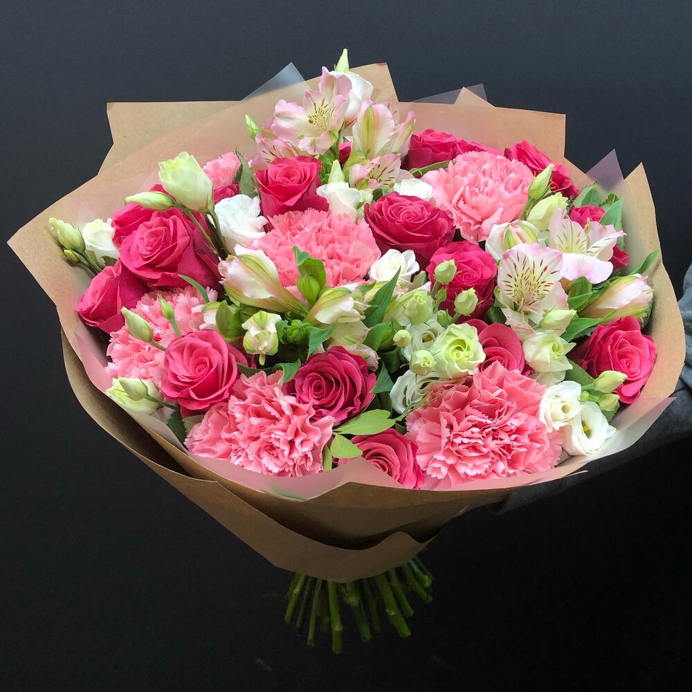 Категории: АльстромерииРозы, Гвоздики, Лизиантусы