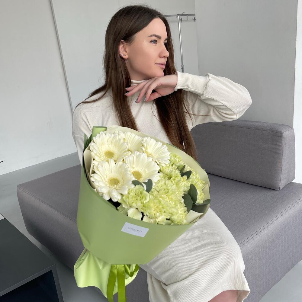 Гербера – 5 шт.Диантус – 14 шт.Эвкалипт – 3 шт.Упаковка дизайнерская – 2 шт.Лента атласная – 1 шт.наклейка фирменная – 1 шт.