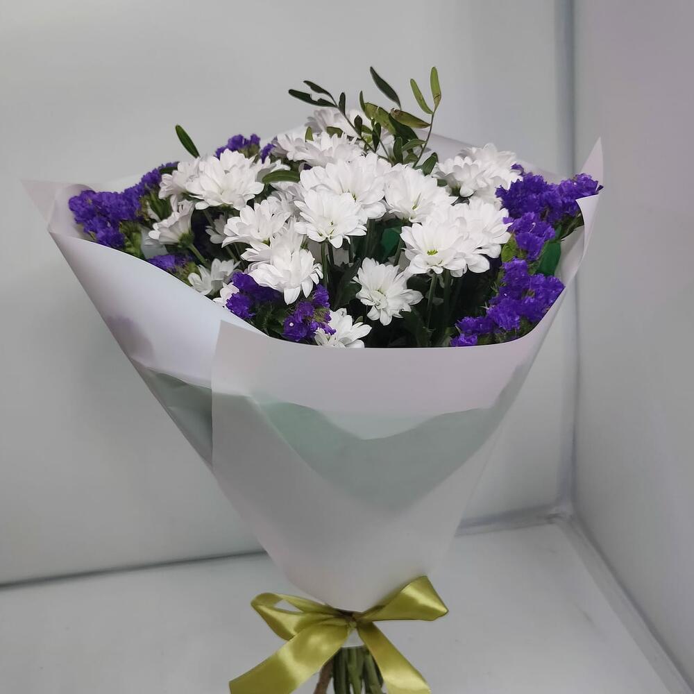 Хризантема кустовая Сантини – 7 шт.Статица – 2 шт.зелень фисташки – 1 шт.Дизайнерская упаковка – 1 шт.