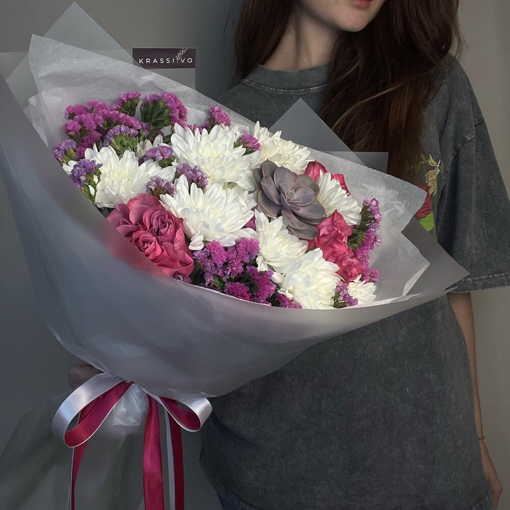 Альстромерии, Гвоздики, Кустовые розы, Лизиантусы, Розы, Хризантемы
