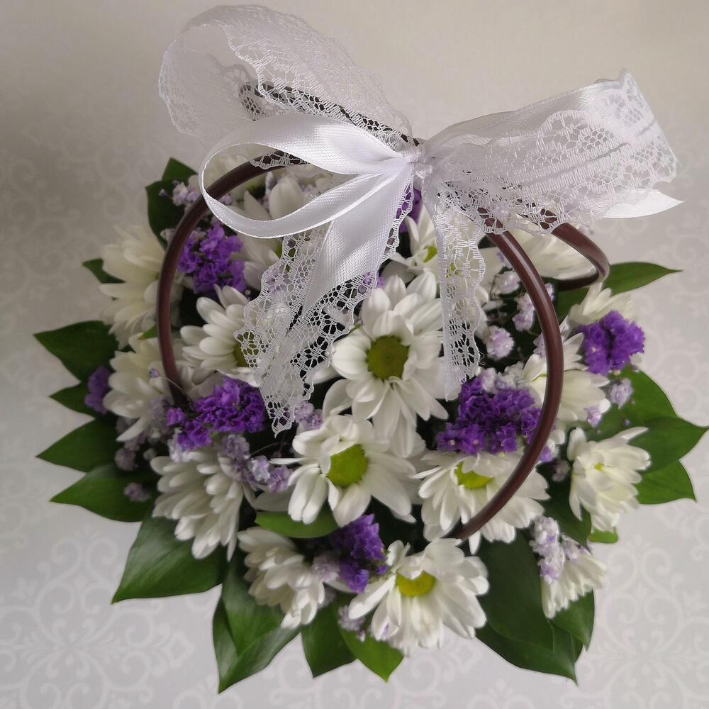 Ромашковидные хризантемы в сочетании с фиолетовой статицей в сиреневой сумочке для Вас.Свежие долгоиграющие цветы.