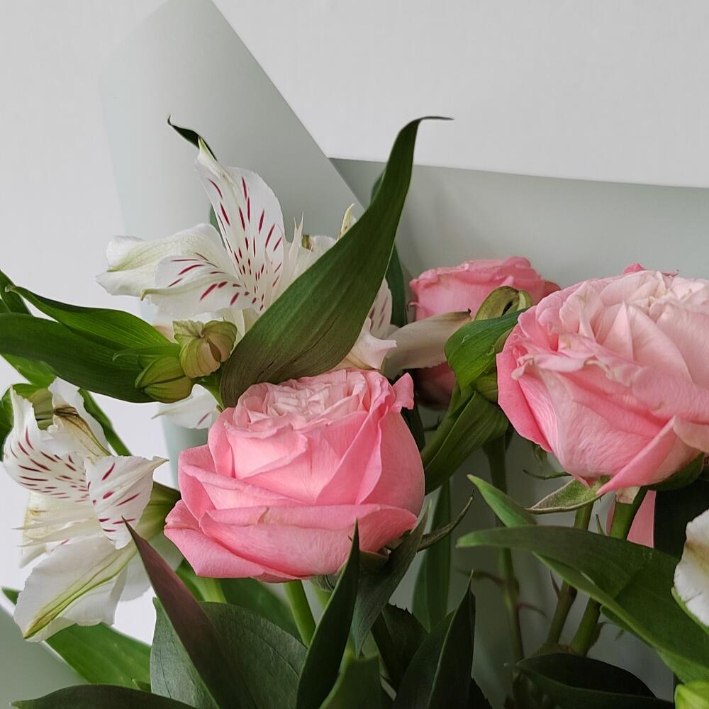 Альстромерия – 2 шт.Лента – 2 шт.Роза кустовая – 1 шт.Рускус – 3 шт.Роза – 1 шт.Упаковка – 1 шт.Эустома – 1 шт.