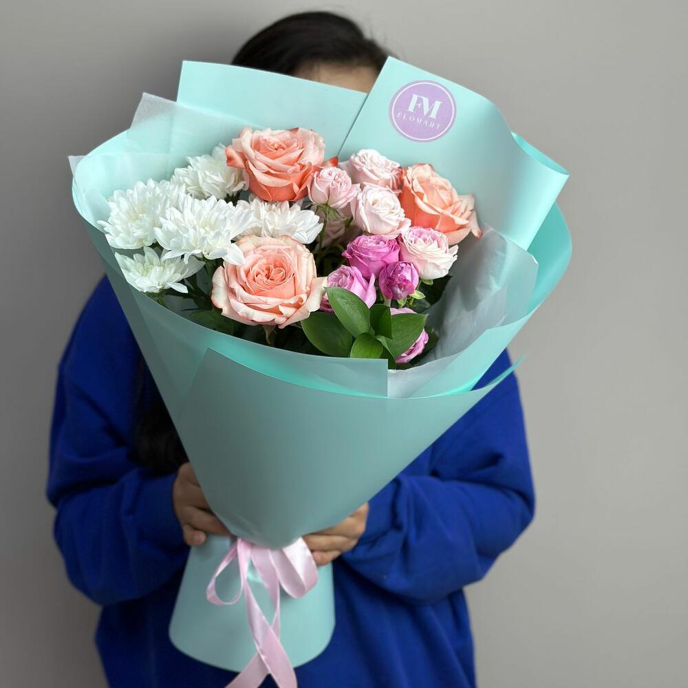 Альстромерии, Кустовые розы, Лизиантусы, Пионовидные розы, Розы, Ромашки