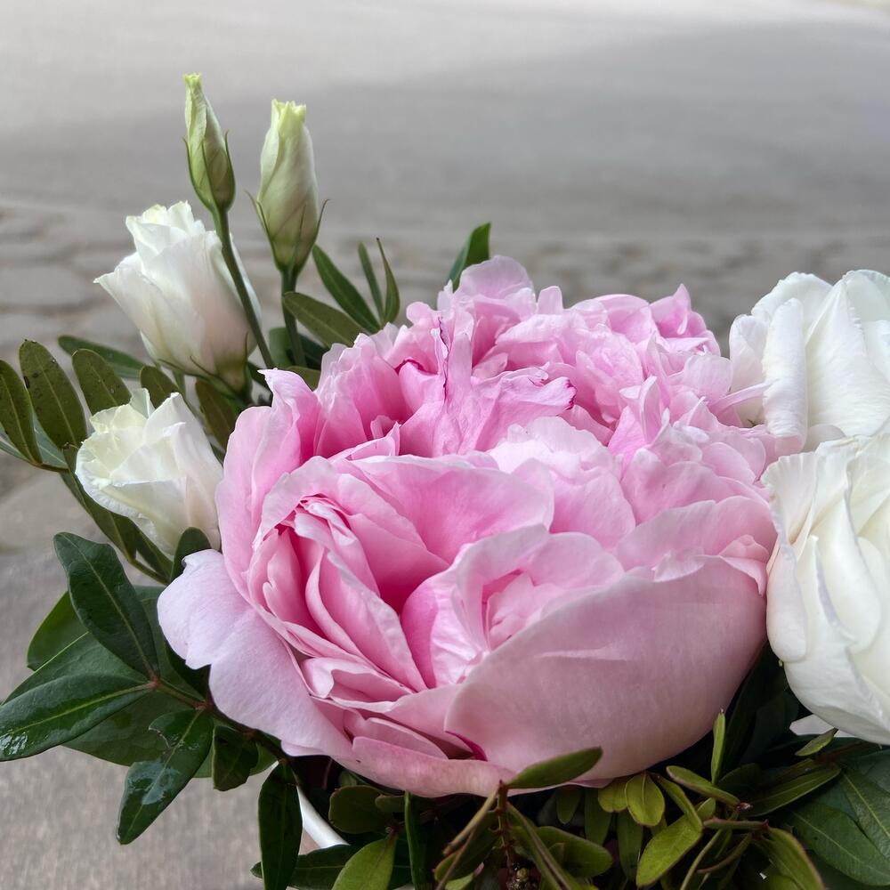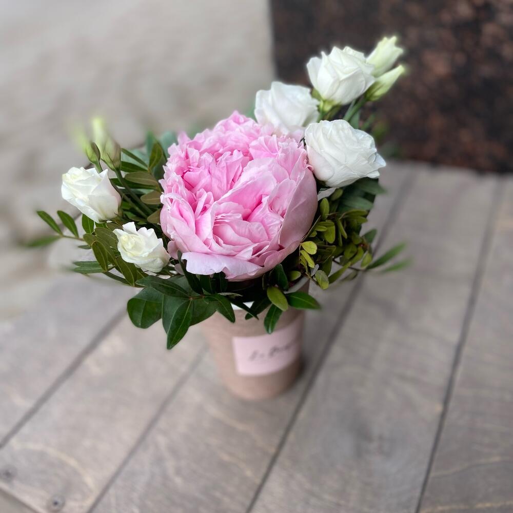 Лизиантус – 1 шт.Пион – 1 шт.Фисташка – 1 шт.Оазис флористический – 1 шт.Стакан крафт дизайнерский – 1 шт.
