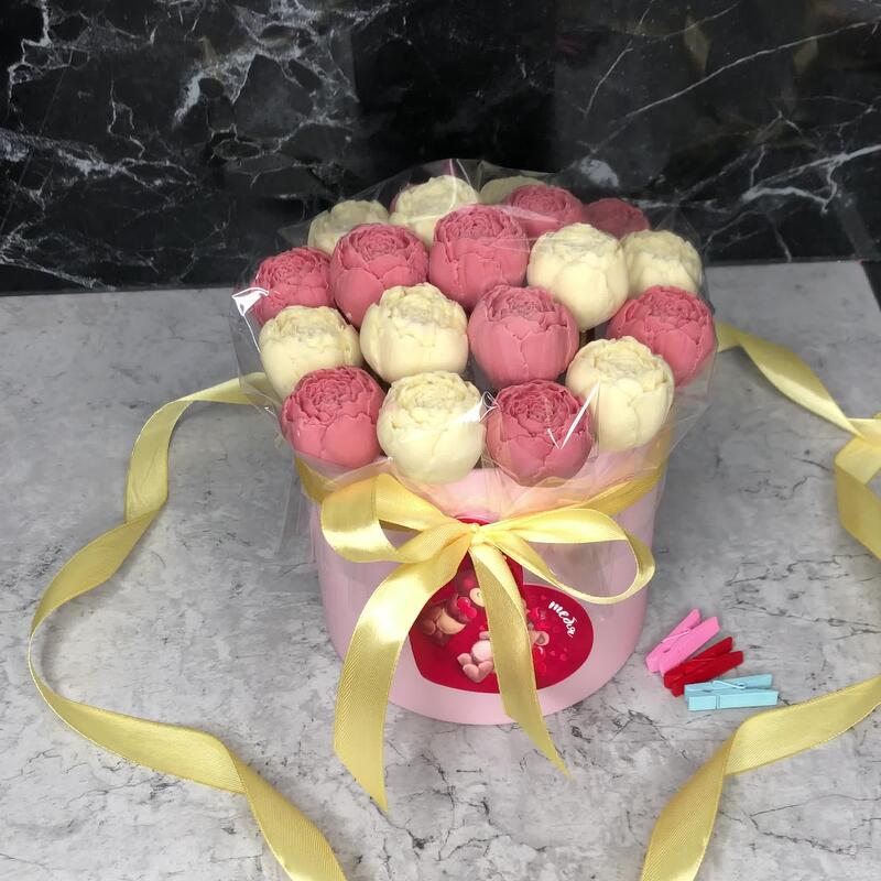 Мини открытка – 1 шт.шоколадные пионы из бельгийского шоколада – 19 шт.