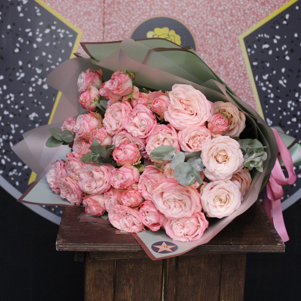 Эвкалипт – 2 шт.Лента атласная – 1 шт.Роза кустовая пионовидная мадам бомбастик – 11 шт.Пленка дизайнерская – 3 шт.