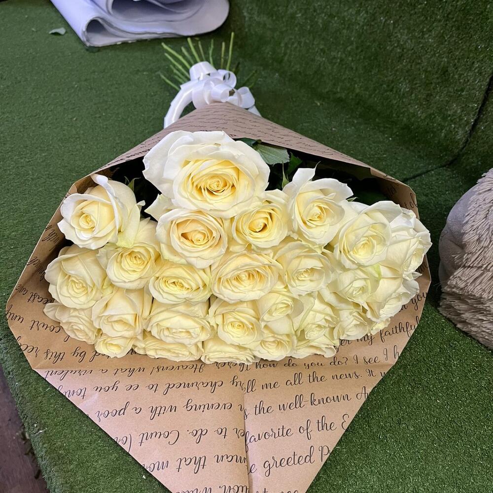 розы эквадор белые – 27 шт.Крафт упаковка – 2 шт.Лента атласная – 1 шт.