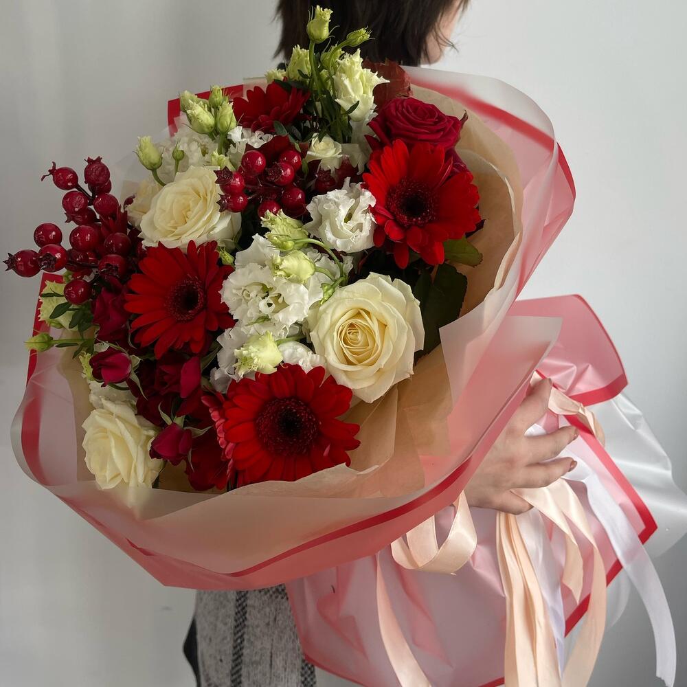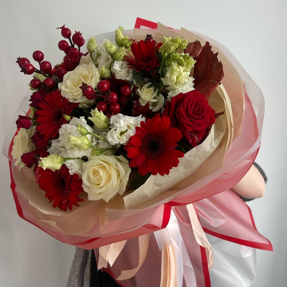 герберы – 7 шт.Эустома – 4 шт.Роза белая – 5 шт.Роза кустовая – 3 шт.Роза красная – 1 шт.Ягоды декоративные – 5 шт.Листья Дуба – 2 шт.Салал пучок – 1 шт.Тишью – 2 шт.Пленка матовая – 6 шт.Лента атласная – 2 шт.