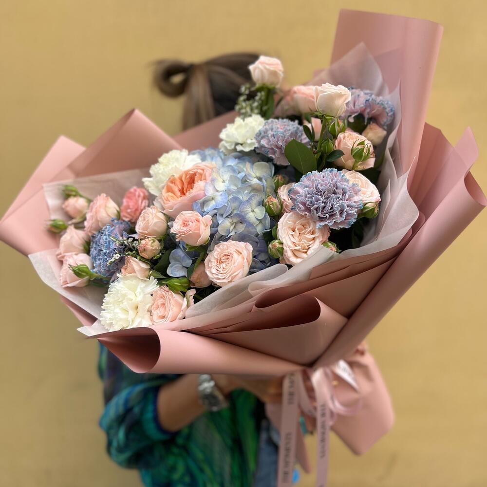 “Эвкалиптическая роскошь” гортензия и пионовидная кустовая роза