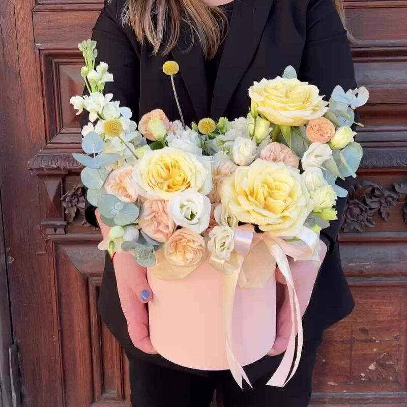 роза кэндллайт – 3 шт.роза кустовая пионовидная трендсеттер – 2 шт.Краспедия – 3 шт.эустома махровая белая – 1 шт.эустома розита вайт – 1 шт.Маттиола – 1 шт.Эвкалипт – 3 шт.Оазис флористический – 1 шт.Коробка шляпная – 1 шт.Лента атласная – 2 шт.