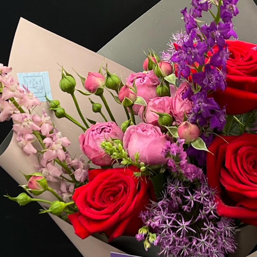Роза Эквадор – 3 шт. Луковичные растения – 3 шт. Пионовидная кустовая роза – 1 шт. Лимониум – 2 шт. Упаковка дизайнерская – 2 шт. Открыточка с вашими пожеланиями – 1 шт. инструкция по уходу за цветами – 1 шт.