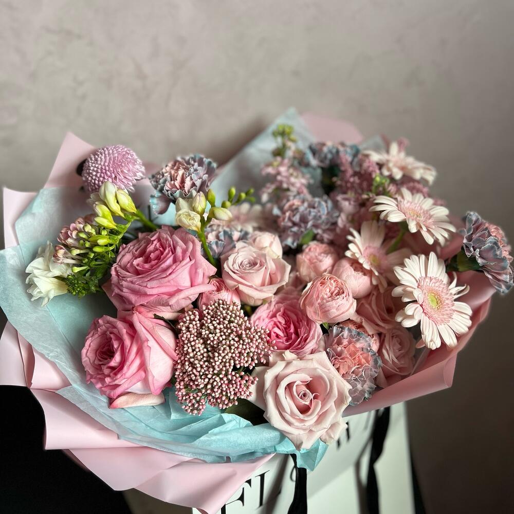 Кустовая пионовидная роза – 2 шт.Пионовидная одноголовая роза – 3 шт.Гвоздика – 6 шт.Фрезия – 3 шт.Гербера – 5 шт.Хризантема – 1 шт.Маттиола – 2 шт.Бувардия – 2 шт.Озотамнус – 1 шт.Солидаго – 1 шт.Роза одноголовая – 6 шт.декоративная упаковка – 1 шт.Атласная лента – 1 шт.
