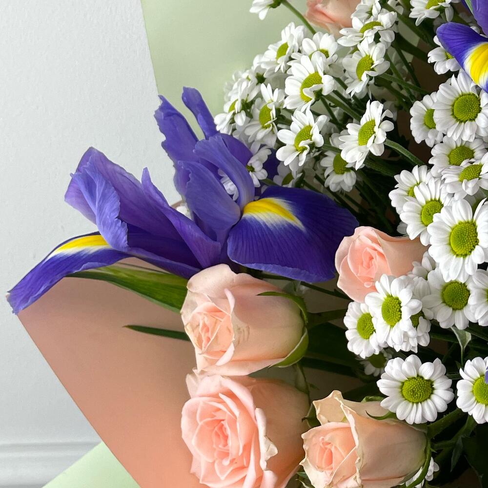 Сантини – 3 шт.Ирис – 5 шт.Кустовая роза – 5 шт.Пленка дизайнерская – 1 шт.Лента – 1 шт.