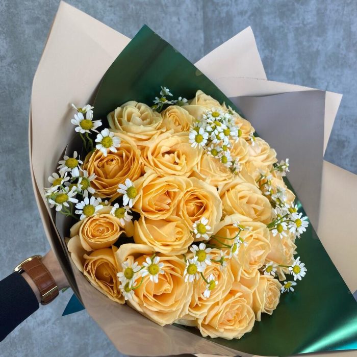 Букет из 25 персиковых роз с матрикарией