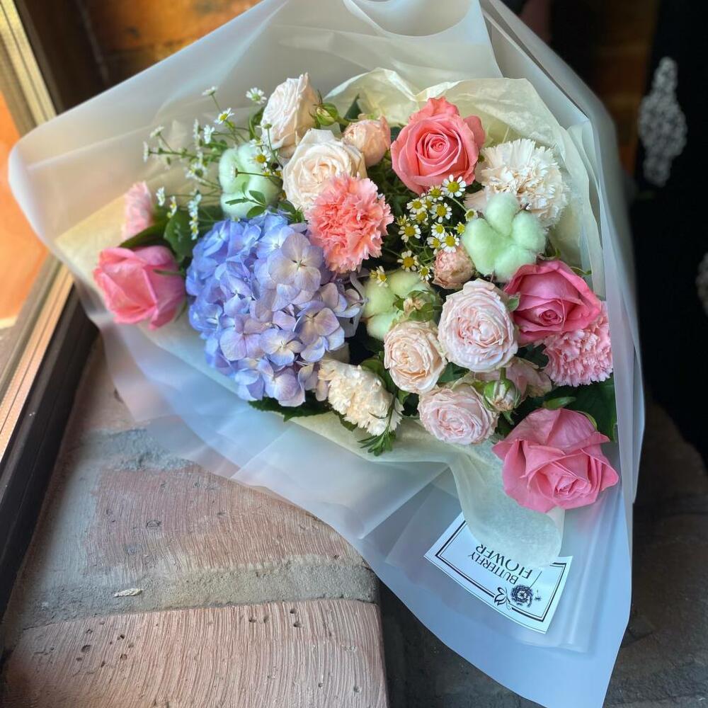 Гортензия – 1 шт.Кустовая роза – 2 шт.Диантус – 5 шт.Роза – 4 шт.Хлопок – 3 шт.Матрикария – 2 шт.Самшит – 2 шт.Упаковка – 2 шт.