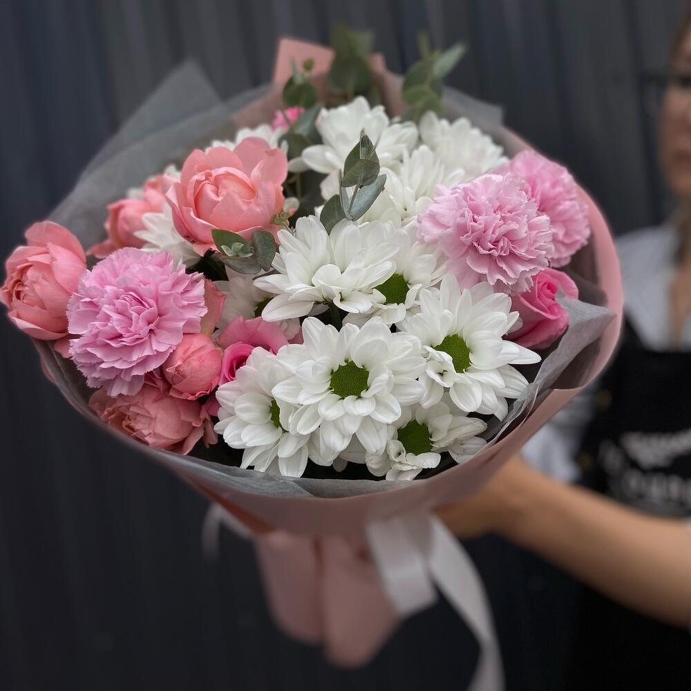 Нежный, легкий букет из стойких хризантем, диантуса и очаровательной пионовидной розы Джульетта