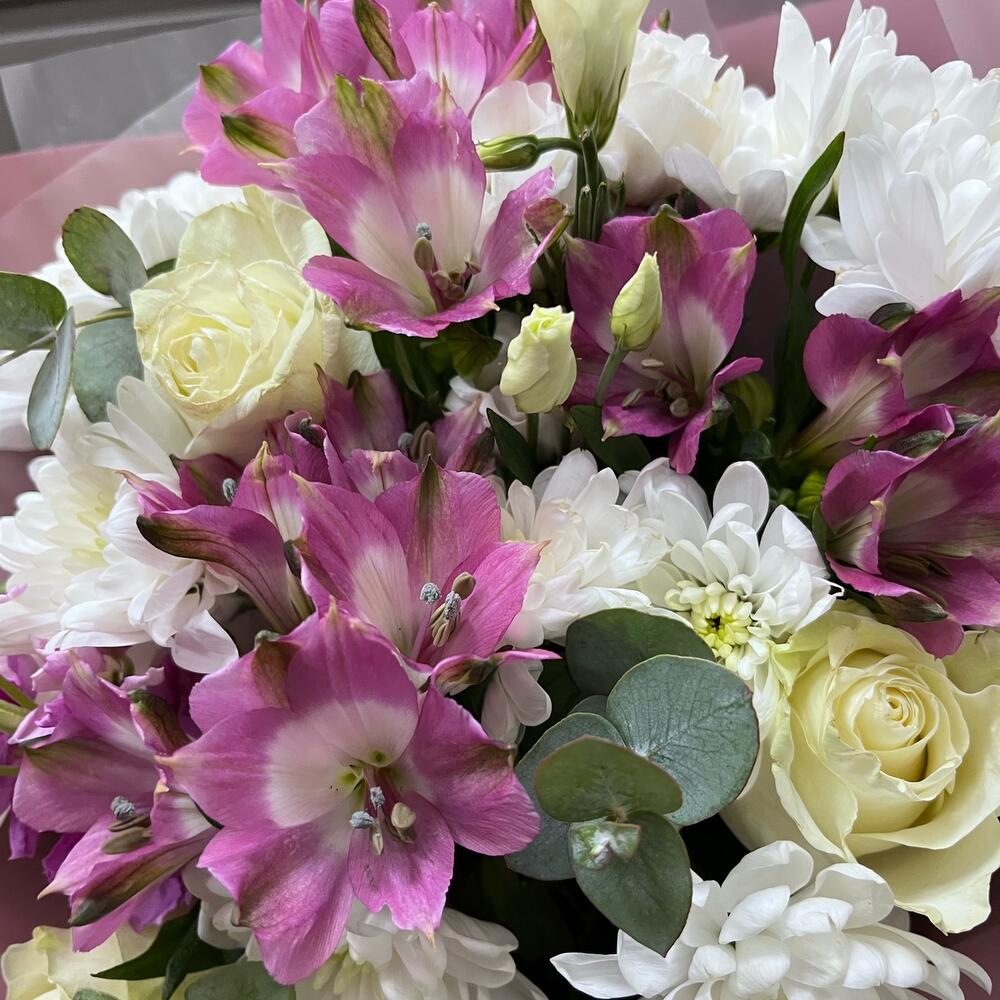 Хризантема кустовая – 3 шт.Роза – 3 шт.Альстромерия – 3 шт.Эвкалипт – 2 шт.Эустома – 2 шт.Маттиола – 1 шт.Оформление – 1 шт.