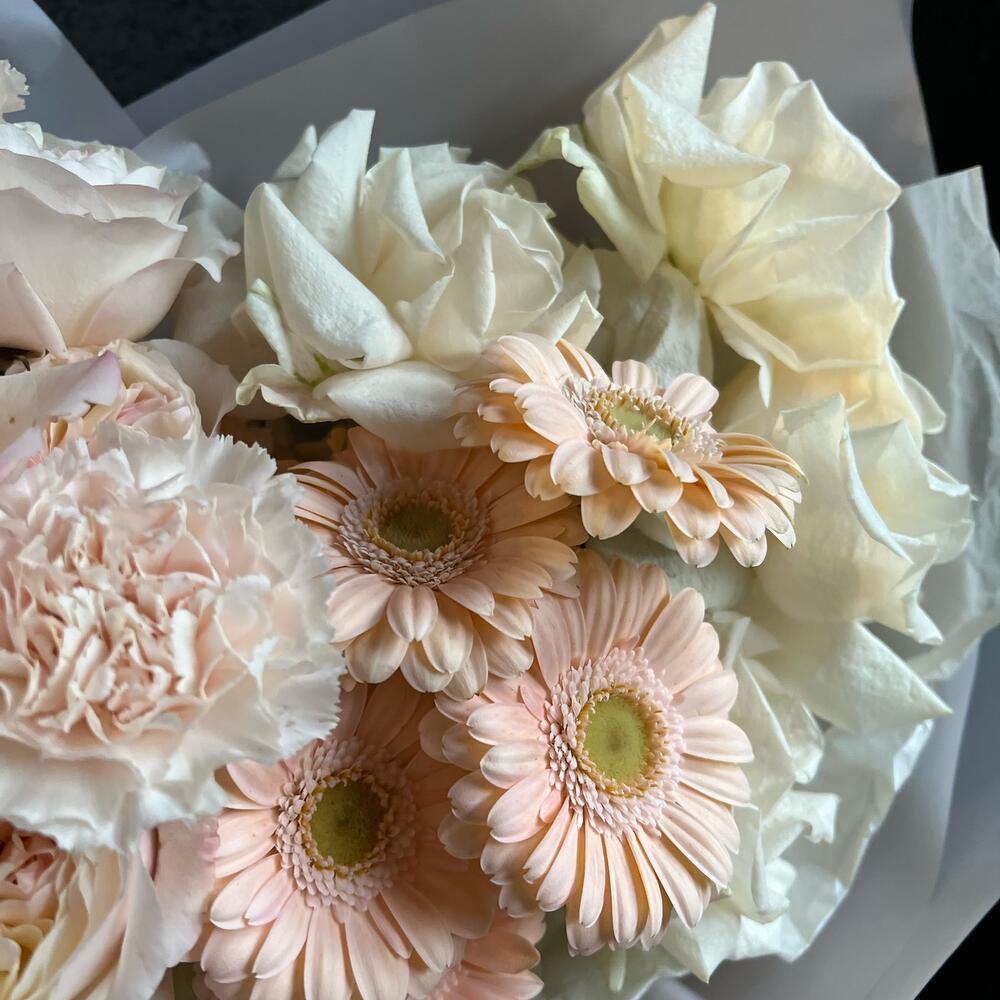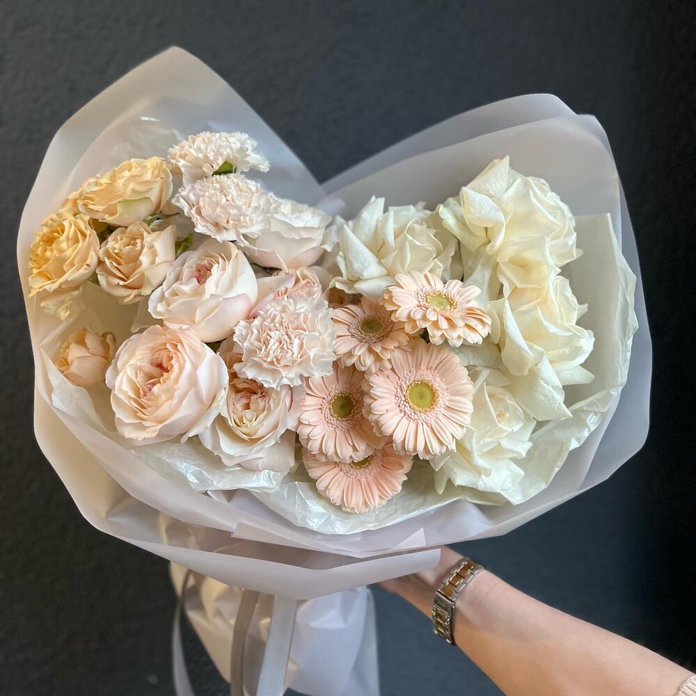 Одноголовая роза – 4 шт.Гербера – 5 шт.Диантус – 3 шт.Пионовидная роза – 5 шт.Кустовая роза – 1 шт.декоративная упаковка – 1 шт.Атласная лента – 1 шт.