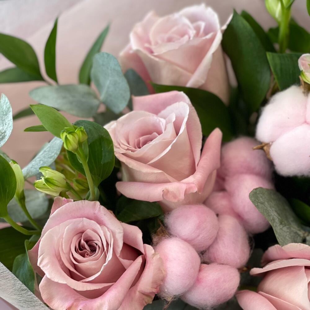 Букет с нежными розами и хлопком “Нежность”