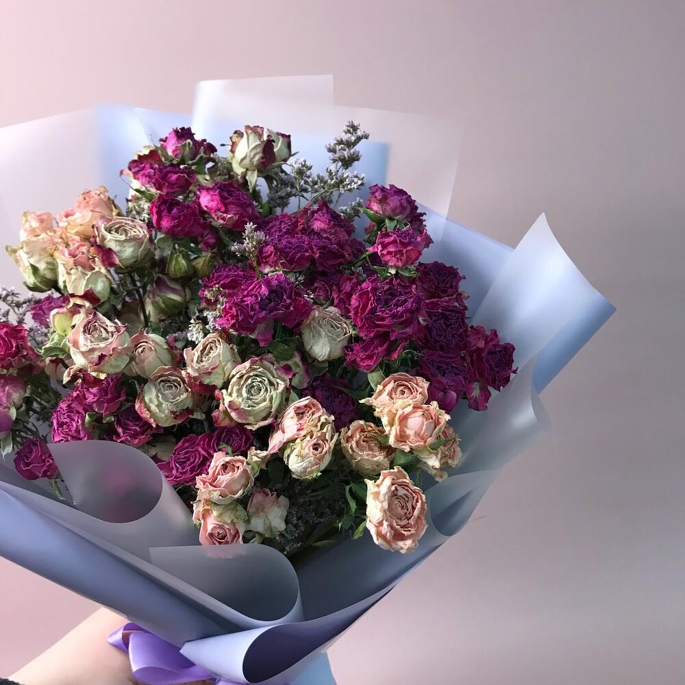 роза кустовая засушенная – 11 шт.лимониум засушенный – 5 шт.Оформление – 1 шт.
