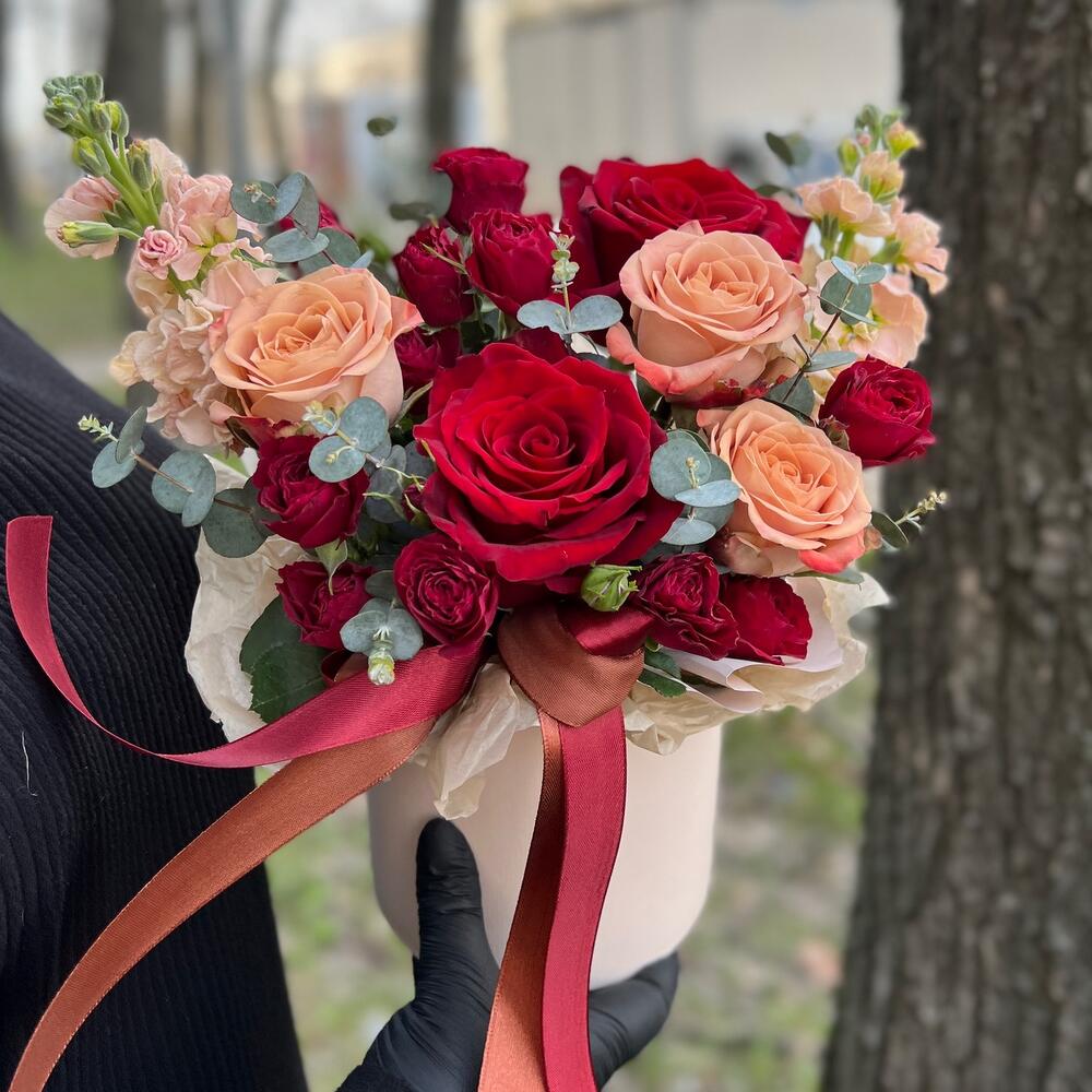 Маттиола – 2 шт.Роза Капучино – 3 шт.Эвкалипт – 3 шт.Лента атласная – 2 шт.Коробка шляпная – 1 шт.Роза Эксплорер – 3 шт.Оазис флористический – 1 шт.роза кустовая пионовидная ред трендсеттер – 2 шт.