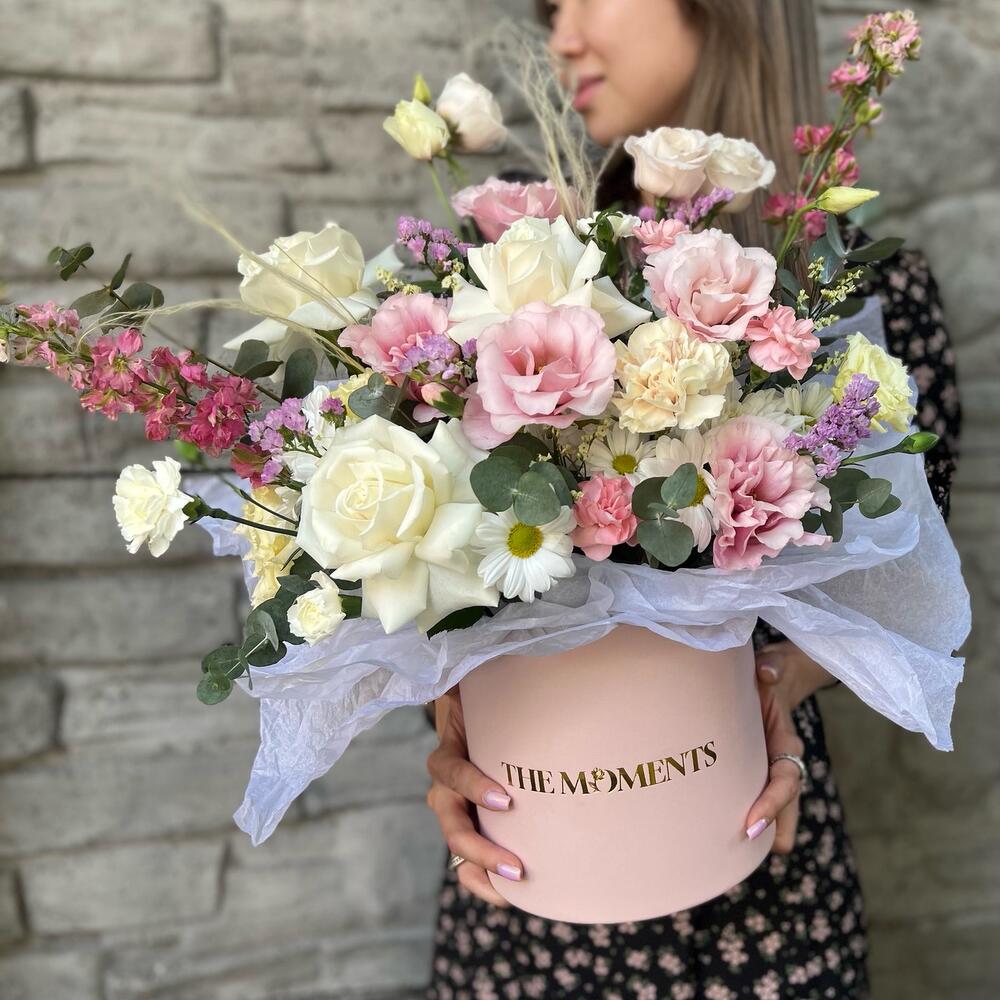 "Атлас☁️" - цветочная композиция с зефиром в деревянном ящике