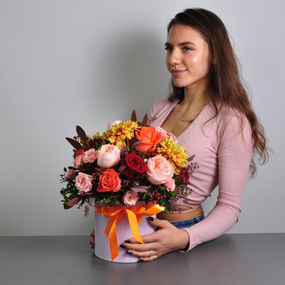 Сказочная осень в цветочной коробочке! Яркие оттенки роз и хризантем подарят вашему получателю тёплое и солнечное настроение!Яркий контрастный букет с пионовидными розами станет прекрасным подарком на день рождения, юбилей.Букет можно подарить на рождение ребёнка, … Показать ещёкрестины, годовщину свадьбы, день Учителя или другое праздничное событие)