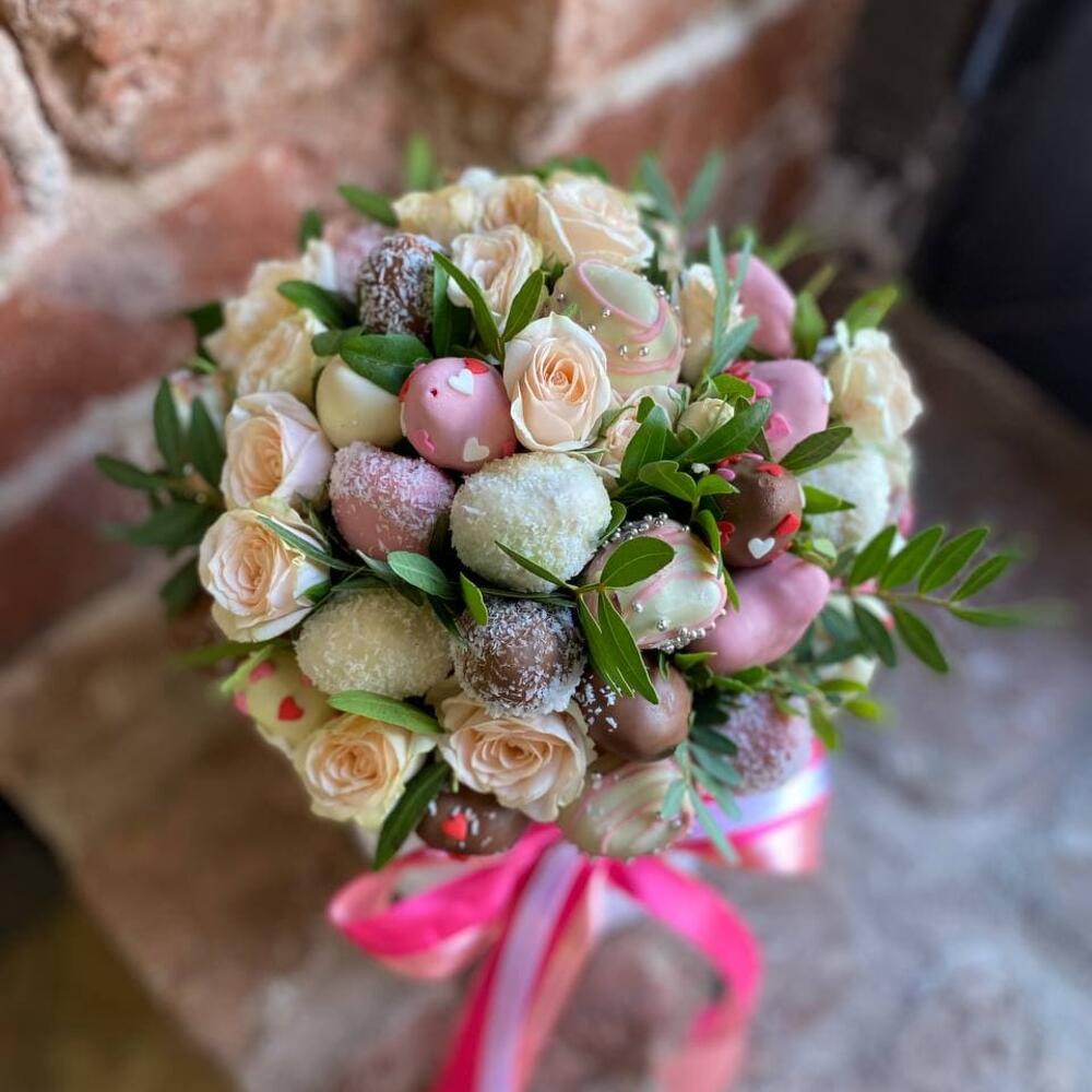 Композиция из клубники в шоколаде, мяты и кустовых роз "Эвредика"