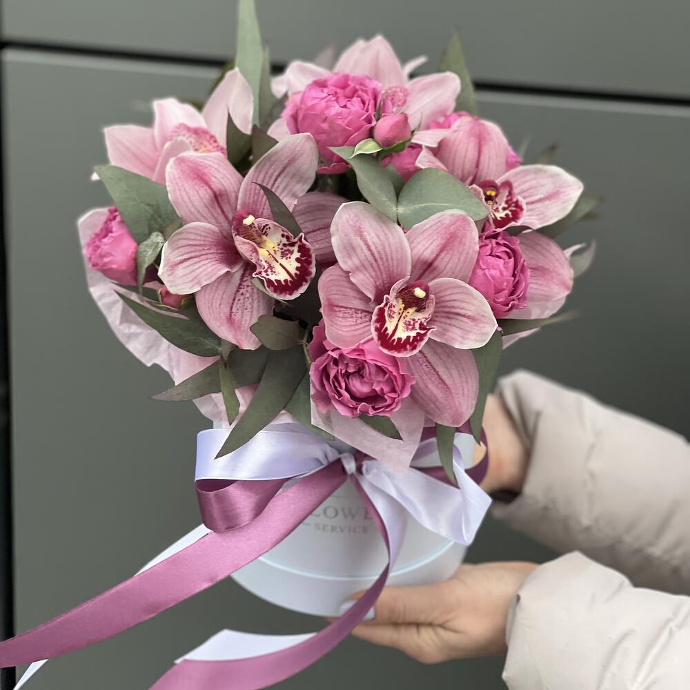 цимбидиум (орхидея) – 7 шт. кустовая пионовидная роза misty bubbles – 3 шт. Эвкалипт – 2 шт. Коробка – 1 шт. Оазис – 1 шт.