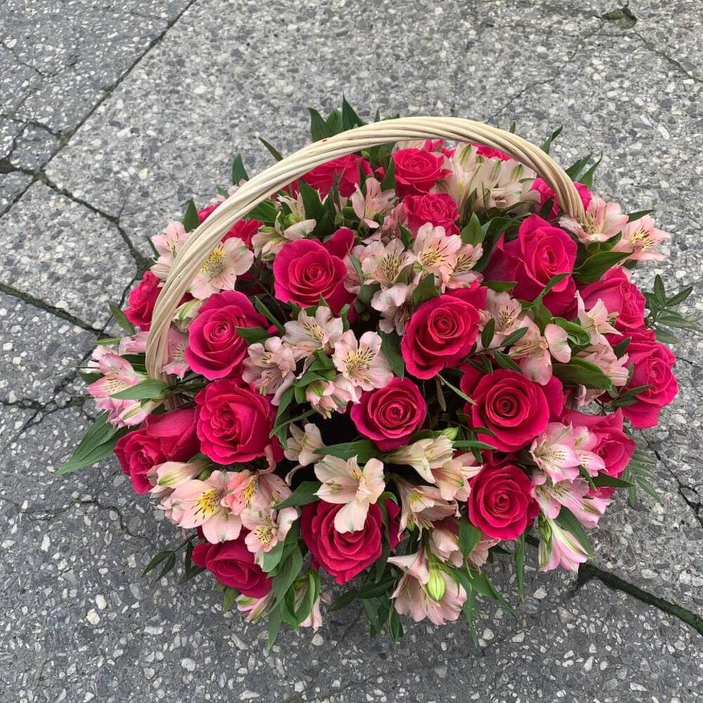 Корзина с розовыми розами и альстромериями «Синтия»