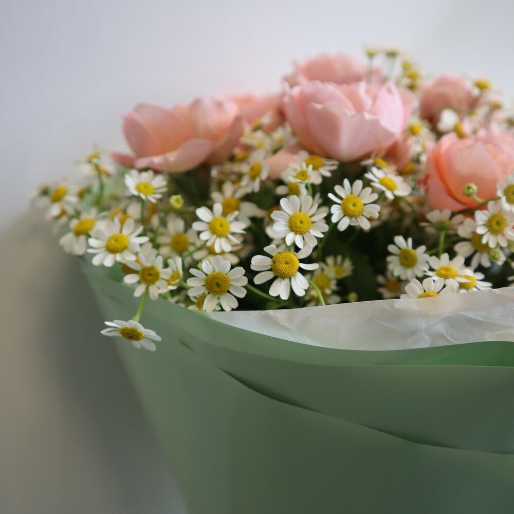 роза кустовая джульетта пионовидная – 3 шт.Матрикария (Ромашка Камила) – 5 шт.тишью водостойкое – 5 шт.пленка глянцевая – 4 шт.Рафия – 1 шт.