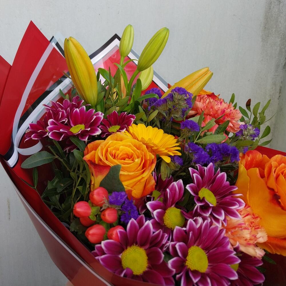Гербера мини – 1 шт.Фисташка – 10 шт.Гвоздика сортовая – 1 шт.Упаковка дизайнерская – 3 шт.Хиперикум красный – 2 шт.Азиатская лилия – 1 шт.хрищате кустовая – 2 шт.салантай роза – 3 шт.