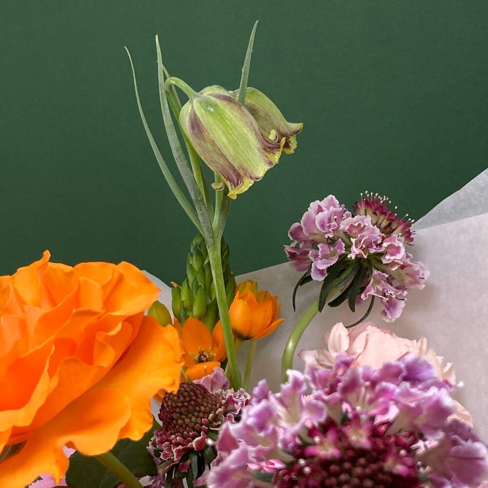 Скабиоза – 3 шт.Роза – 4 шт.Гвоздика – 8 шт.Орнитогалум – 2 шт.Фритиллярия – 1 шт.