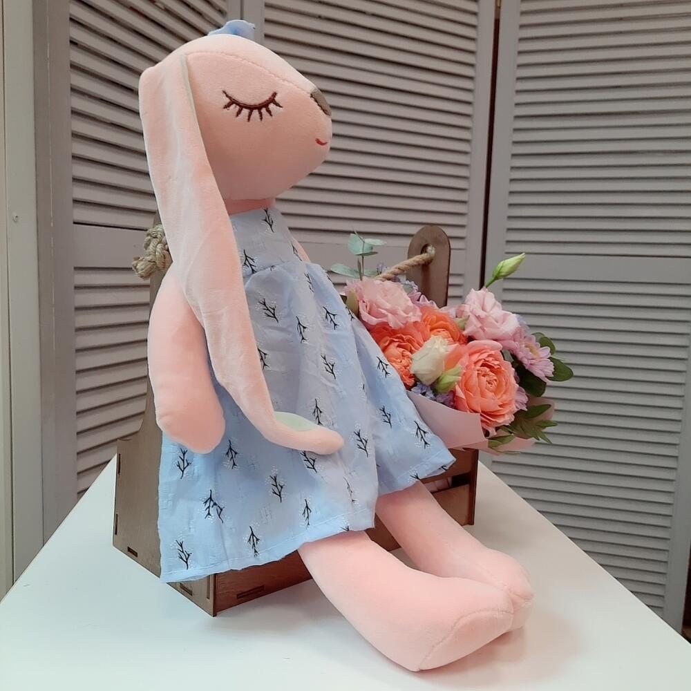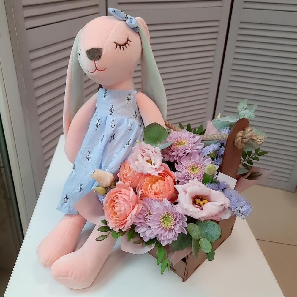 Статица – 1 шт.Хризантема кустовая – 1 шт.Эустома – 1 шт.Роза пионовидная кустовая – 1 шт.Ящик деревянный подарочный – 1 шт.Губка флористическая – 1 шт.зелень декоративная – 7 шт.зайка плюшевый 45 см – 1 шт.
