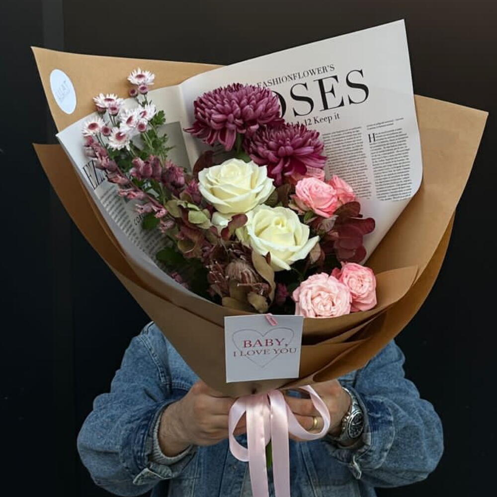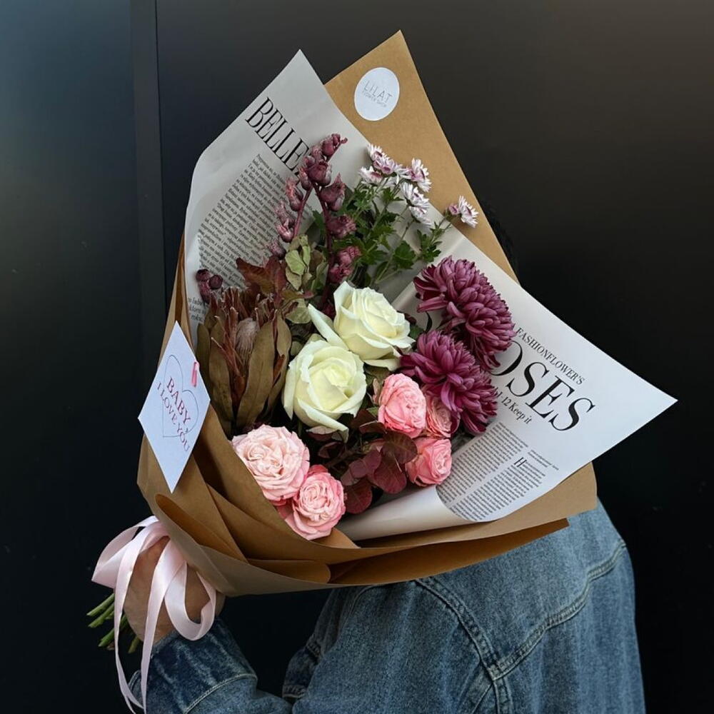 Гвоздики, Кустовые розы, Лизиантусы, Пионовидные розы, Розы