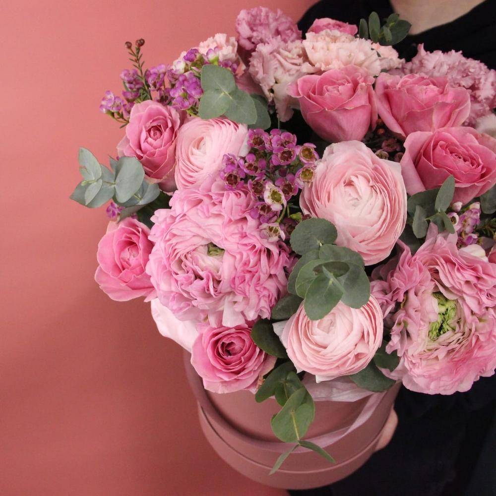 Шляпная коробка с ранункулюсами, розами, лизиантусом, ваксфлауэром, диантусом и эвкалиптом.