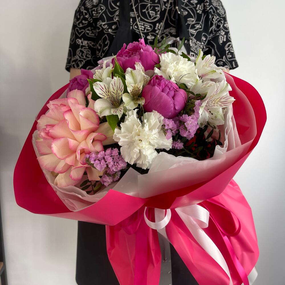 Альстромерии, Кустовые розы, Лизиантусы, Пионовидные розы, Розы, Ромашки