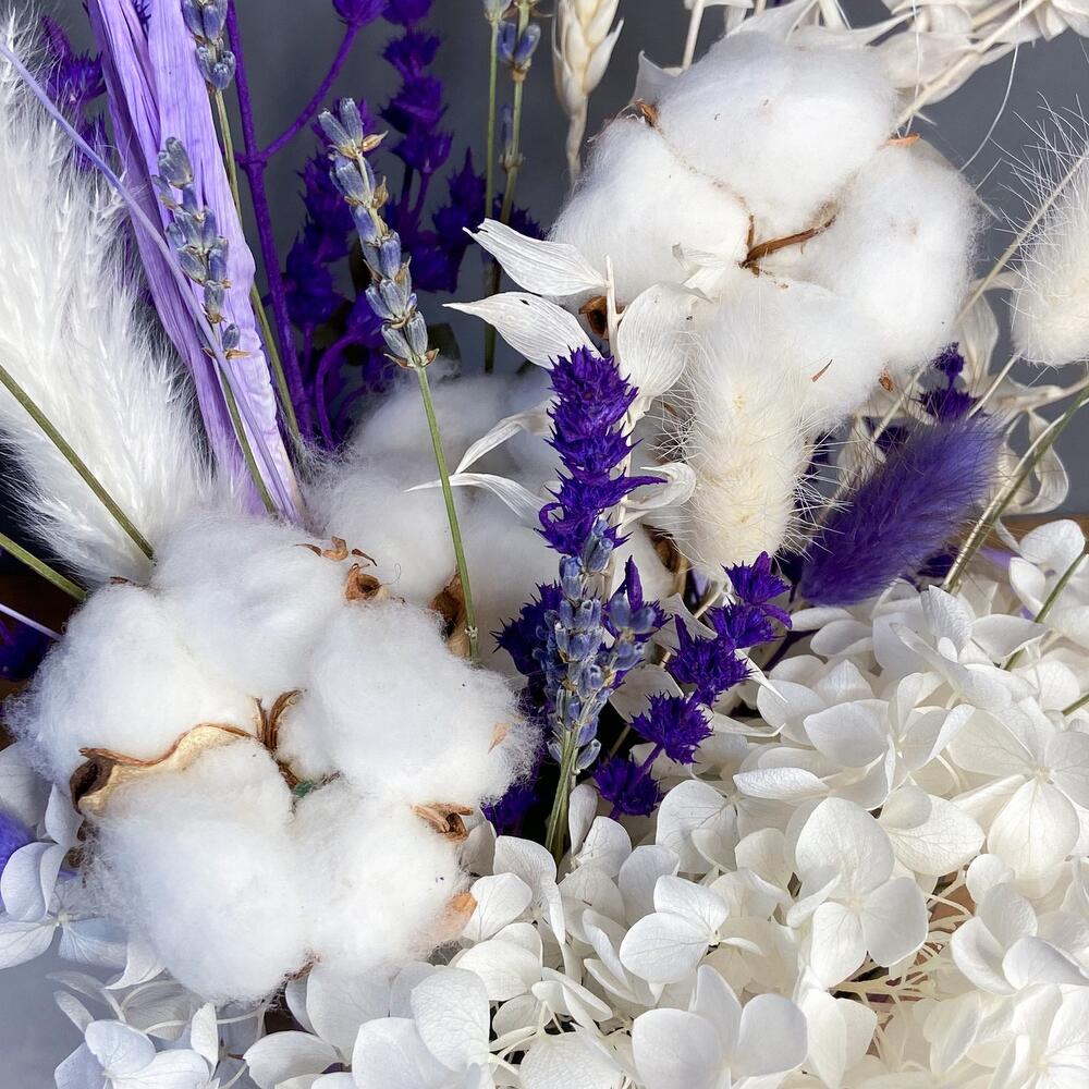 Лаванда (сухоцвет) – 7 шт.Колоски пшеницы – 2 шт.Хлопок натуральный – 3 шт.Лагурус (сухоцвет) – 7 шт.камыш декоративный – 1 шт.иглица крашенная – 1 шт.гортензия белая стабилизированная – 1 шт.банка жестяная – 1 шт.сетария сухоцвет – 1 шт.шандра стабилизированная – 2 шт.