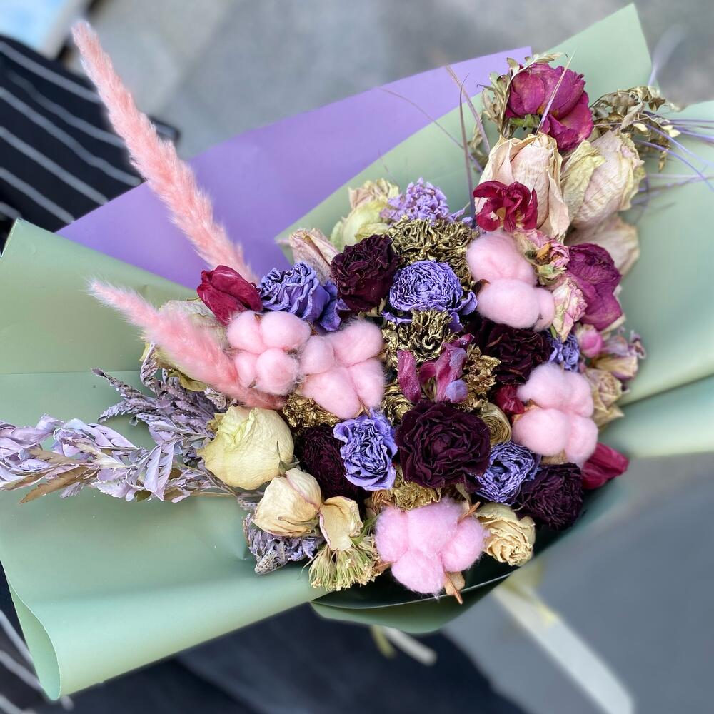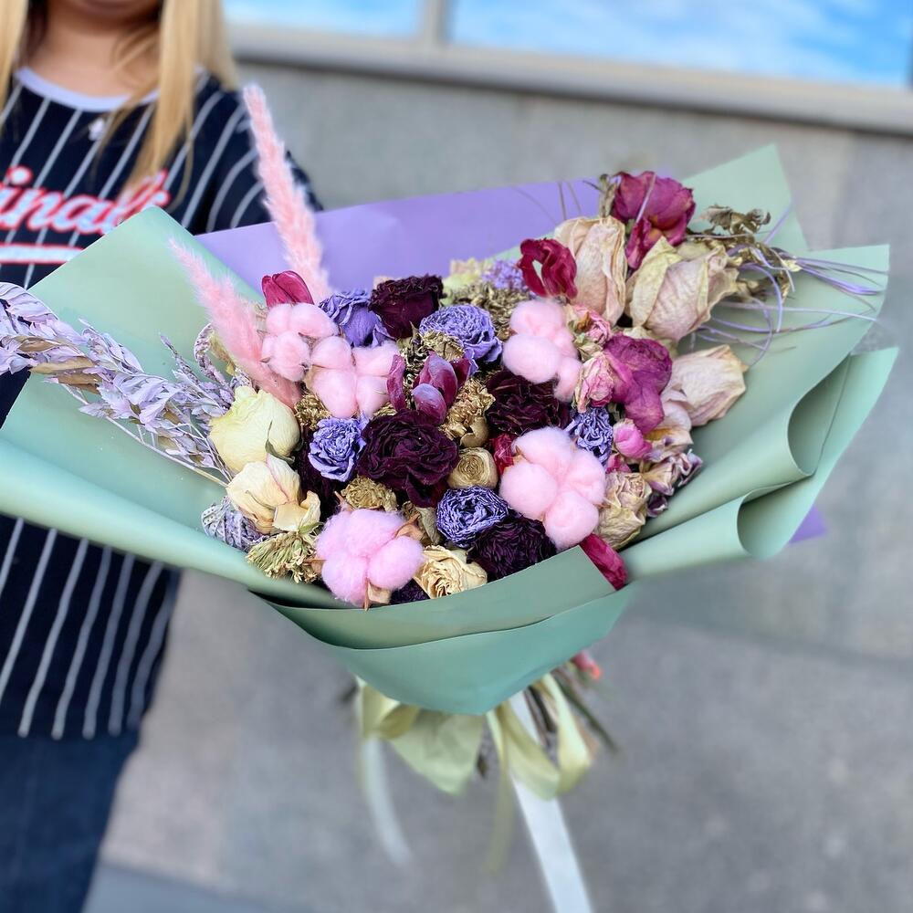 Современный практичный подарокБукетик который будет вас радовать долго.Сухоцветы- это цветы, которые не привередливые.Это отличное решение для интерьера в вашем доме или офисе.