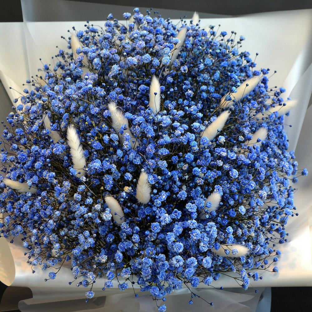 Лагурус – 20 шт.Гипсофила синяя – 11 шт.стильная упаковка букета – 1 шт.