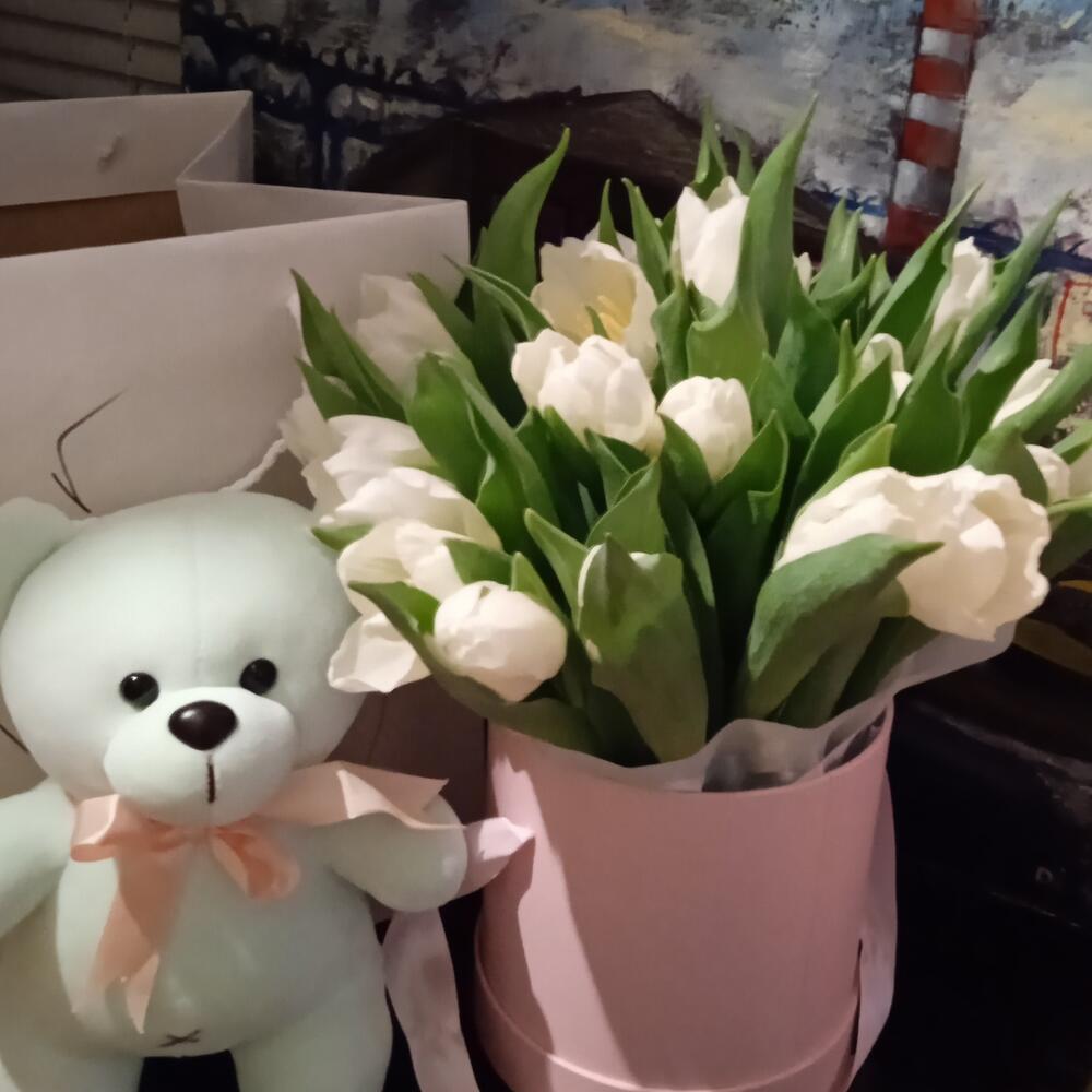 Тюльпаны в шляпной коробке с Мишкой